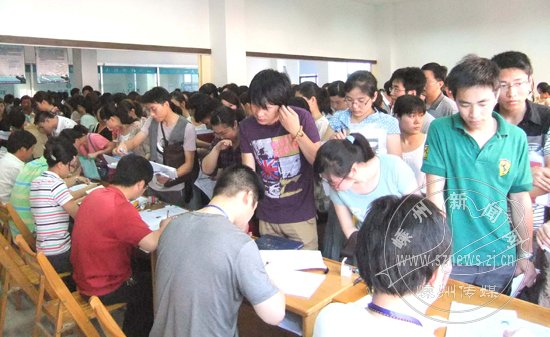 昨日,2011年嵊州市公开招聘事业单位工作人员报名工作在市人才市场内举行,12个部门单位计划招考聘用事业单位工作人员共计457名。记者在报名现场看到,报名者排起了长队,报名场面十分火爆。