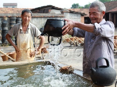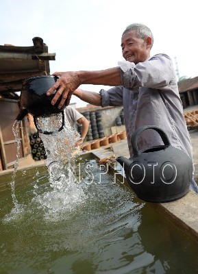 7月4日,浙江省嵊州市甘霖镇桂山村民间制陶艺人,正用原始的水灌法检验土陶茶壶是否渗漏。浙江省嵊州市甘霖镇桂山村是嵊州万年小黄山遗址所在地,属于2005年度全国十大考古新发现。近年来,人们环保意识的重视,土陶茶壶仍有市场,当地为数不多的手工土陶制作艺人,仍用古老的方法制作土陶茶壶,满足品茶爱好者的需求。