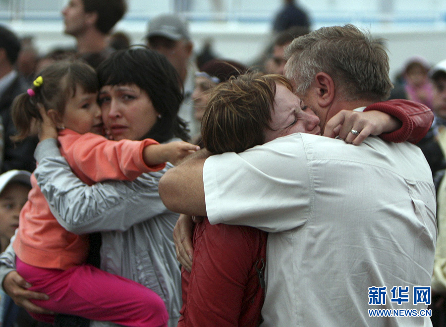 7月10日,在俄罗斯喀山,沉船事故中的幸存者获救上岸后互相拥抱。俄罗斯紧急情况部10日夜发布消息说,在俄伏尔加河发生的沉船事故造成的死亡人数上升到2人,失踪人数增加到103人,已有80人获救。新华社/路透
