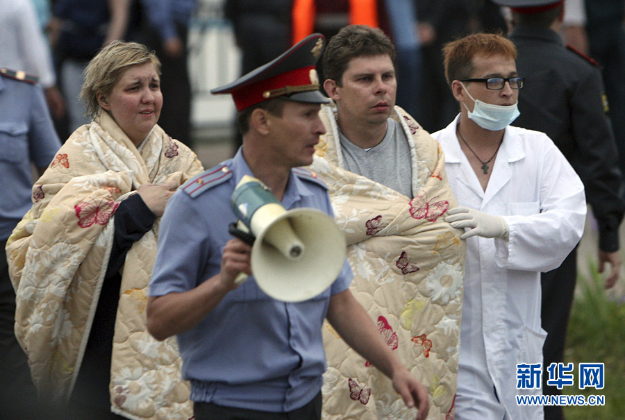 7月10日,在俄罗斯喀山,工作人员协助沉船事故中的两名名幸存者裹着毛毯上岸。俄罗斯紧急情况部10日夜发布消息说,在俄伏尔加河发生的沉船事故造成的死亡人数上升到2人,失踪人数增加到103人,已有80人获救。新华社/路透