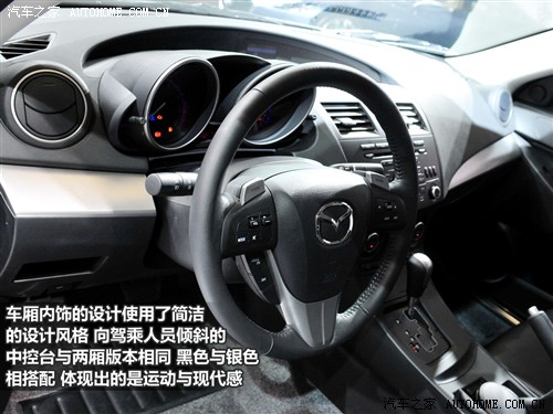 内饰方面三厢版马自达3和两厢版几乎完全一样,和老款车型相比造型更加具有立体感和层次感,在保持运动风格的同时变得更加时尚。中控台、仪表盘以及方向盘等都经过重新设计。