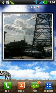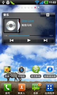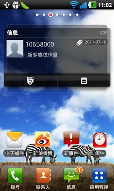 解锁完成后就会出现LG P970的主界面。主界面简单的理解就是类似于电脑的桌面。共设有七个分页,每一分页都会有不同的显示内容。例如界面一显示的是天气信息,界面二显示的手机接收到的短消息,界面三显示的日历日程信息、界面四显示的腾讯微博的即时状态,界面五显示的网络搜索的快捷入口,界面六显示的音乐播放器的快捷入口,界面七显示的手机相册里的图片信息。当然这些界面显示的内容都可以设置,稍后会教大家。