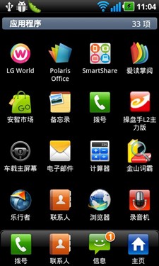 此时点击“应用程序”就会打开LG P970内置和下载的全部应用列表。Android系统手机的应用程序和传统诺基亚塞班系统手机对应用程序的定义不太一样。塞班手机的应用程序指的是内置及下载的软件。而Android手机中的短消息、设置、联系人这样的基本功能,以及所有下载的软件均会显示在“应用程序之中”,也就是说Android手机的应用程序涵盖了塞班手机的所有操作项目。