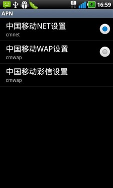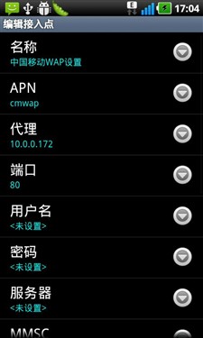 首先依旧是打开设置选项,找到“无线和网络”选项,下拉并找到“移动网络选项”。然后选择“接入点名称”,里面有三种不同的接入方式,分别是“中国移动cmnet设置”、“中国移动cmwap设置”和“中国移动彩信设置”。以中国移动cmwap设置为例,点击“中国移动cmwap设置”,按照下列参数设定即可。具体参数如图: