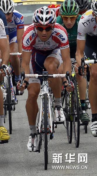国际自行车联盟7月11日宣布,参加环法自行车赛的俄罗斯车手科洛布涅夫兴奋剂检测呈阳性,这也是2011赛季环法赛上爆出的首例兴奋剂丑闻。图为科洛布涅夫(前)在环法自行车赛第八赛段比赛中的资料照片(7月8日摄)。新华社/路透