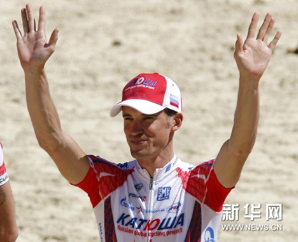 国际自行车联盟7月11日宣布,参加环法自行车赛的俄罗斯车手科洛布涅夫兴奋剂检测呈阳性,这也是2011赛季环法赛上爆出的首例兴奋剂丑闻。图为科洛布涅夫在环法赛前的选手介绍会上(6月30日摄)。新华社/路透