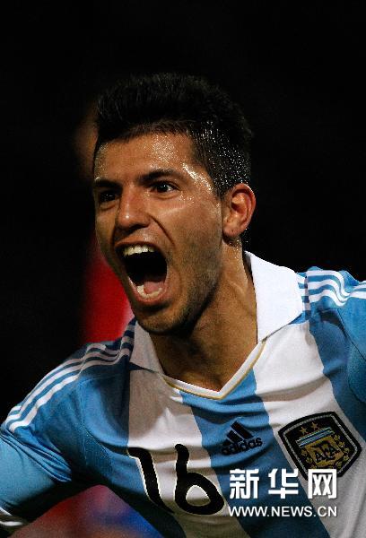 7月11日,阿根廷球员阿圭罗在比赛中庆祝进球。当日,阿根廷队在美洲杯小组赛A组的比赛中,以3比0战胜哥斯达黎加队,以小组赛3战一胜两平的战绩,获得小组出线。新华社发(吉列尔莫·阿里亚斯摄)