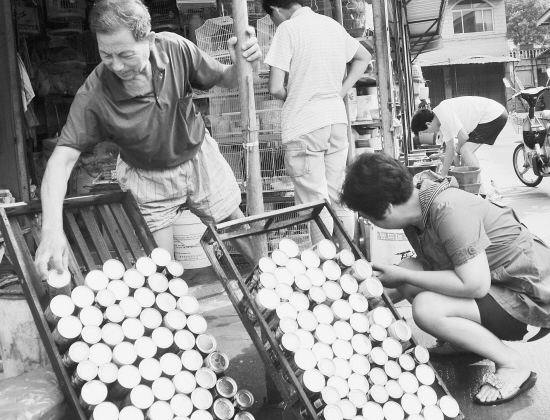 7月16日,嵊州市花鸟市场里一位经营者在摊位前晒回收来的易拉罐,令很多人大惑不解。摊主说,这是给垂钓者绕钓鱼线用的,易拉罐长长的柱体用起来方便。 【来源:天天商报】