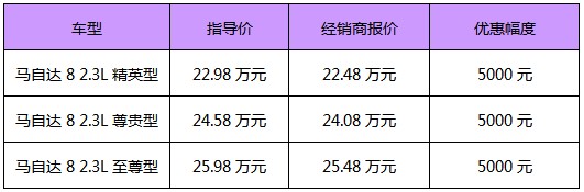 近日,编辑从广州驭达一汽马自达专营店了解到,近期MPV车型马自达8全系优惠5000元。目前店内现车紧缺,提车周期大概在一周左右。目前店内还推出了贷款购车的优惠政策,首付一半即可享受免息、免手续费的贷款优惠政策。感兴趣的朋友不妨致电经销商或到店详谈。