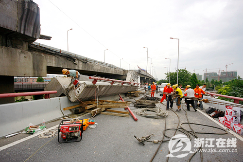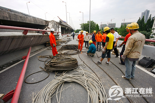钱江三桥塌落现场开始清理 滨江下匝道口封闭