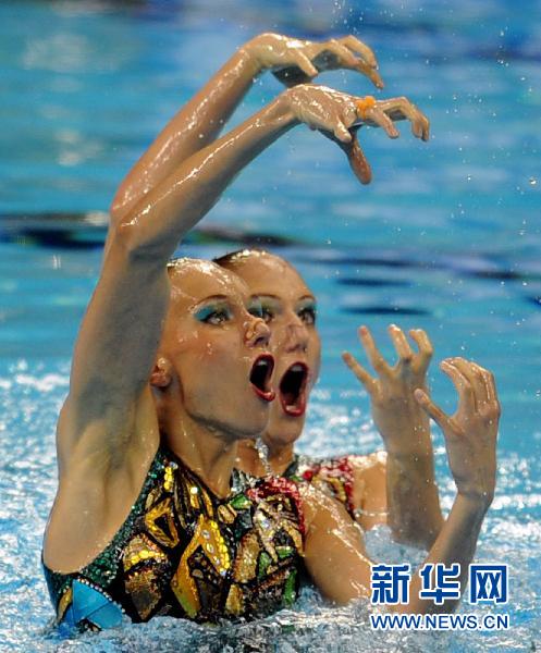 7月18日,西班牙选手卡布内尔/弗恩特斯在决赛中。当日,在第14届国际泳联世锦赛花样游泳双人技术决赛中,卡布内尔/弗恩特斯以95.400分的成绩获得铜牌。新华社记者任珑摄