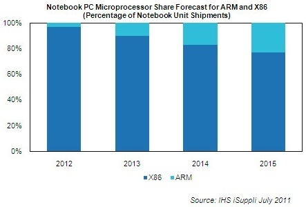 IHS-iSuppli分析师马太·威尔金斯(Matthew Wilkins)今天发表报告称,“由x86架构处理器主导市场30多年后,PC处理器市场将迎来真正的竞争。”据威尔金斯称,随着未来数年ARM处理器发货量激增——2015年约四分之一的笔记本将配置ARM处理器,PC处理器市场上将出现真正的竞争。