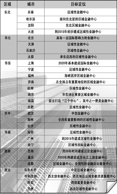 至此,我国内地至少有30多个城市提出规划建设金融中心。其中,上海、北京要建设“国际金融中心”,昆明、南宁和乌鲁木齐分别要建“泛亚金融中心”、“区域性国际金融中心”、“中亚区域金融中心”,其余20多个城市,也雄心勃勃提出所在区域的“金融中心”。如何看待各地争建金融中心这一现象?中国是否需要这么多的金融中心?