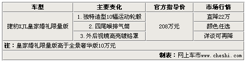 此次上市的捷豹XJL皇家婚礼限量版,比3.0的全景商务版高111.2万,较5.0L的全景奢华版高出10万元,现售的这两款车型市场优惠在10万元左右。相对于这两款车型,皇家婚礼限量版新增了视觉冲击力更强的独特的10辐轮毂、四排气尾喉、外后视镜高亮镀铬等3点外观配置,店内优惠22万元,仅186万元提车,另外,到店详谈还会有更进一步的优惠;另外,店内针对捷豹用户喜爱追求独特、高贵尊崇的特性,推出了多种车漆的定制服务,对这款车感兴趣可以到店一赏。