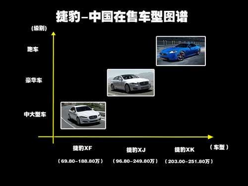 纵观捷豹家族图谱来看,捷豹家族在华所售车型涵盖了中大型车、豪华车、跑车等豪华车都应有的细分市场,涵盖了69.8-251.8万不等的价格区间;其中融入了很多现代元素的中大型车XF和运动型豪华轿车XJ两大车型在中国成功的完成了转型,而XK在跑车中200万以上的售价所表现的特性还是很有号召力的,3款车型各具特色,选择哪款就看需求了~