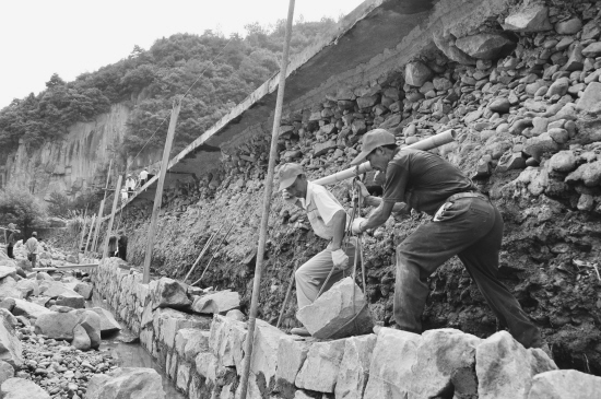 因前期连降大雨,导致嵊州山体土石疏松,部分道路发生不同程度的土石塌方。据不完全统计,该市已发生公路塌方约26500立方米,冲毁路面220平方米、路基1200立方米、挡土墙4600立方米、涵洞10处。趁近期天气晴好,交通部门正组织工作人员紧张抢修。图为该市方贵线甘霖段100米被毁路基正在抢修之中。【来源:绍兴晚报】