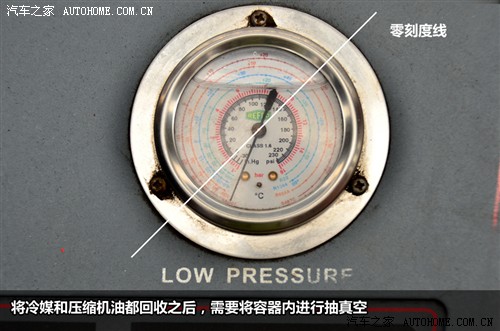 在将冷媒和压缩机油都回收之后,需要将压缩机容器内进行抽真空,此时压力表会直至0刻度之下。在抽真空操作进行完成后(以指针抵达0刻度之下为标准)约10分钟,观察指针是否有不稳定的跳动会回升情况发生。如果有,代表管路有破损或泄漏。