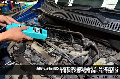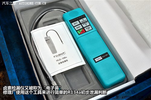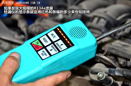 而要看机舱内是否存在大量泄漏的冷媒,可以通过敏感的“电子鼻”检漏仪来进行侦测,特别是对于空调管路的接口处尤其需要反复检测,通过检漏仪可以对发动机舱内的冷媒泄漏情况有一个大致的量化了解。