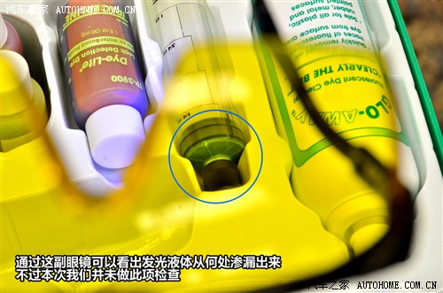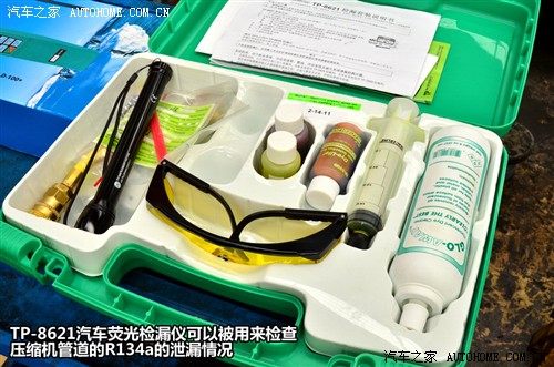 再来,当然就是要检测车辆内侧管道是否存在冷媒的泄漏,修理厂提供的工具是TP-8621型号的汽车荧光检漏仪,通过将配套的液体注入空调循环系统,可以通过特制的荧光眼镜看出冷媒泄漏的区域。不过说实话5年多来,100g左右冷媒损耗对这台老车来说还算是一个比较正常消耗值,因此就不使用这套设备进行精确的检漏了。