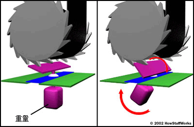以汽车运动触发的锁定机构在卷收器内部设有一个类似钟摆的原件,当车辆突然减速是,惯性会使钟摆元件向前摆动,带动与其连接的卡榫与卷收器卷轴的棘轮紧密咬合,从而达到限位作用。