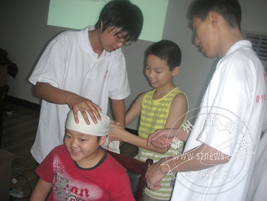 昨日,“流动少年宫”暑期青少年安全自护专项志愿服务行动的志愿者走进剡湖街道城隍坊社区,向社区留守儿童和外来务工人员子女传授消防常识、自我保护、心理保健等平安自护知识。这次活动是由团市委联合绍兴市文理学院医学院安全自护志愿者队伍开展的,志愿者还将前往三界镇外来人员居住地、石璜镇中心小学、贵门乡青少年实践中心及市青少年活动中心等地开展活动。图为志愿者在演示如何进行现场救护。