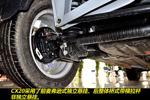 前麦弗逊+后扭力梁的悬挂结构,是CX20继承奔奔底盘的一大佐证(B3平台),前盘(通风)后鼓的制动系统也没有改变,不过CX20整体尺寸的加大是十分明显的。
