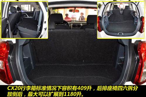 实用性!尽管并非MPV车型,但CX20还是设计了较多的小储物空间,不管是瓶瓶罐罐,还是钱包类的小物品,都能找到存放的一席之地。不仅仅如此,CX20的行李箱空间也非常宽敞,无论是初始容积,还是扩展容积,都达到了小型车中较高的水平。