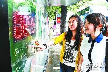 昨天一早,记者在灯市西口公交候车亭看到,在“开心”和“不开心”两个测试按钮的中间区域,一个LED显示屏还在滚动播出网友们在微博上参与“开心”和“不开心”测试后说出的原因。几乎所有候车的乘客都饶有兴趣地参加了测试,还有人趁着等车的时候看看时时更新的微博。