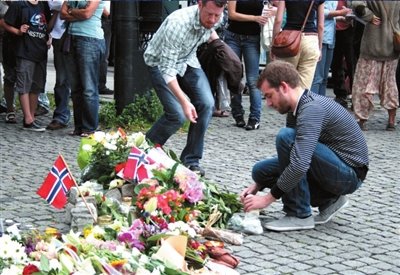 7月23日,一名挪威男子在奥斯陆大教堂前举行的悼念仪式上向死去的亲人献花。新华社发