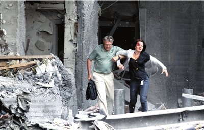 一名受伤妇女被搀扶出爆炸大楼。新华社/美联