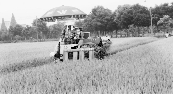 昨日,嵊州市甘霖镇一处早稻田正在收割。今年嵊州市2万多亩早稻在大暑前后开镰收割,进入农业生产抢收早稻、抢种晚稻的双抢环节,与往年不同的是今年的早稻多为机械收割,让农民告别弯腰收割的历史。 (张亮宗 摄)