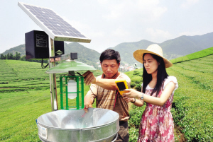 嵊州市贵门乡的万多亩生态茶园采用太阳能生态灭虫仪消灭害虫。这种生态灭虫仪具有诱杀雌性害虫的功能,对茶园起保护作用。图为7月20日,该乡的大学生“村官”张钊萍(右)正与茶园工作人员一起检修太阳能生态灭虫仪。【来源:天天商报】