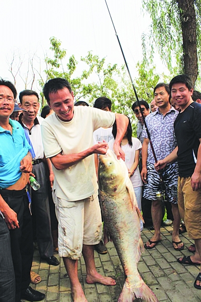 本报讯 23日下午,在扬州北郊保障湖,有人经过一个多小时“人鱼大战”,拽上来一条约50斤重的大鲢鱼(上图)。