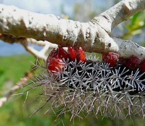 毛毛虫:昆虫世界的小巨人。这是一种生活在巴西南部的飞蛾幼虫。尽管,我们对毛毛虫的恶心模样早就有心理准备,可是这种巴西毛毛虫恶心的模样还是吓了我一跳。从它身上漂亮的保护色便可知道他的毒性也不容小视。据说每年都有许多人因这种毛毛虫毒而死亡。同时这种毛毛虫的毒素也是一种非常好的抗凝血剂,可以用于突发事故伤口的处理。
