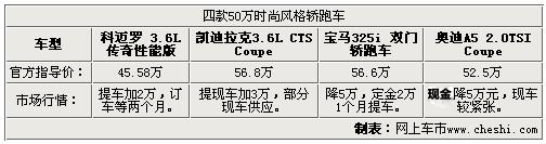 纵观上表:同属于跑车的4款车型市场行情表现各有不同,其中卡迪拉克CTS coupe和科迈罗提车均需要加价,最高需加价3万元,因受众群体较小,所以现车不算很充裕;另外的宝马325i双门轿跑和奥迪A5 coupe车型均出现了5万元的降价,货源依然不足~