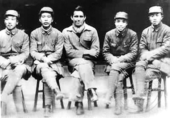1945年1月21日,美国驻华空军中尉驾驶员托勒特(中)驾机空袭上海时,负伤跳伞,被我淞沪游击队营救,送至梁弄养伤,后在东林村进行了归队交接。图为托勒特伤愈归队前与浙东纵队领导人刘亨云(左一)、何克希(左二)、谭启龙(左四)、张文碧(左五)合影。