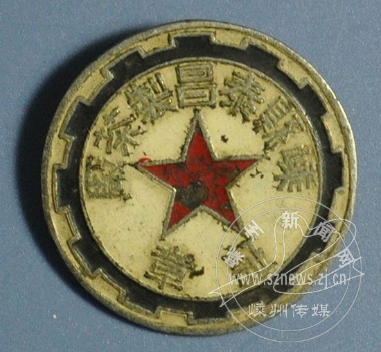 此枚解放初期“嵊县泰昌制茶厂”证章,圆形,直径2.6厘米,有“嵊县泰昌制茶厂证章”繁体字样,中间为红色五角星,外圈环饰齿轮图案,是见证我市茶叶生产历史的实物资料。