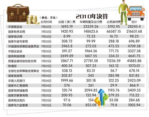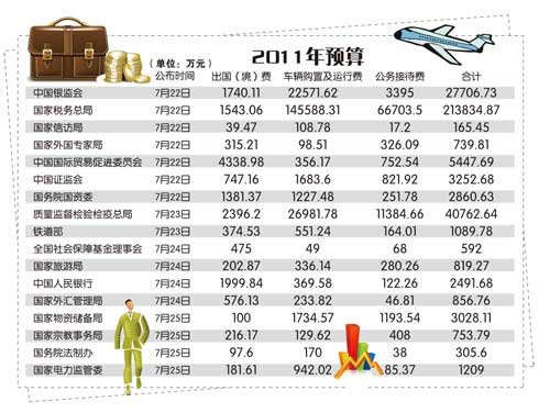 教育部、中科院、中国社科院、国家自然科学基金委、国家行政学院、国家中医药管理局、国家新闻出版总署、新华通讯社、中华全国供销合作总社、中国外文出版发行事业局、国家档案局等11家部门选择在了7月的第二个周五公布;紧接着,国家知识产权局、国家发改委、交通运输部、农业部、监察部、卫生部等6个部门在第三个周五晒出账本;上周五,又有中国银监会、国家税务总局、国家信访局、国家外国专家局、中国国际贸易促进委员会、中国证券监督管理委、国务院国资委等7家部委集中公布。