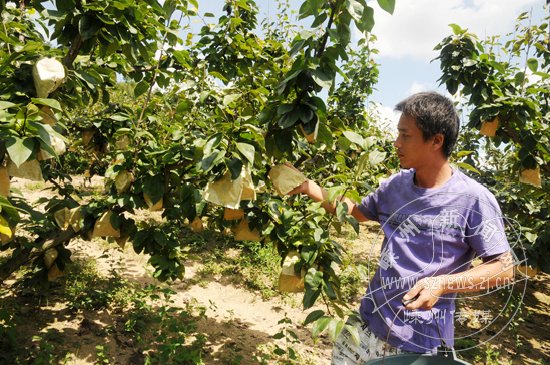 今年是翠冠蜜梨的丰收年。梨园实行了全生态管理,早在一个月前,主人就给每个梨子套上了专用水果袋,使梨子既卫生,又保持了水分。