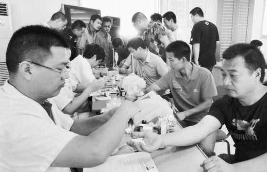 近日,嵊州血库A型与O型血告急,嵊州市鹿山街道办事处获悉后,组织街道百位党员和入党积极分子进行无偿献血,当场共献血10900毫升。图为7月25日献血现场。 (张亮宗 冯阿英 摄)