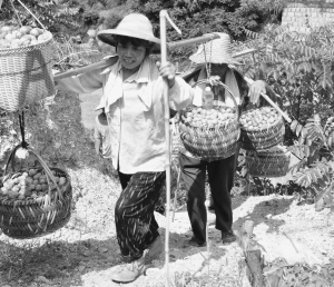 7月27日,嵊州市金庭镇成功山上,果农正在采摘桃形李,他们用肩挑的方式从大山里运出桃形李,再在合作社里分级销售。