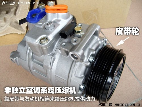 非独立空调系统:就是直接利用发动机来驱动空调系统,压缩机需要通过发动机经皮带来传输动力,而压缩机是空调的核心设备,它的作用是让制冷剂可以在空调系统管线内进行循环,给制冷剂气体加压,经过冷凝器使其变为液态,然后再经过蒸发器让液态制冷剂蒸发并且吸收大量热量,来实现制冷的作用。
