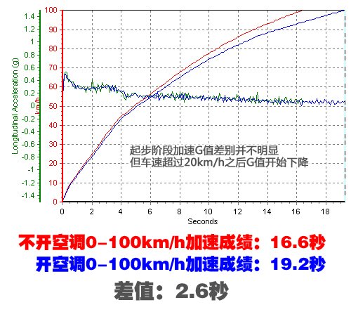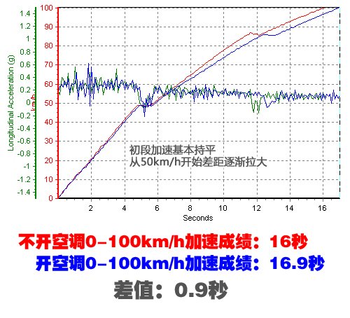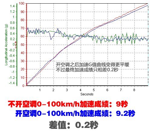 (这次测试只是对比开/关空调两种情况下的加速成绩,而由于测试车车况以及测试条件不同,会与之前单车的测试成绩有一定差别)