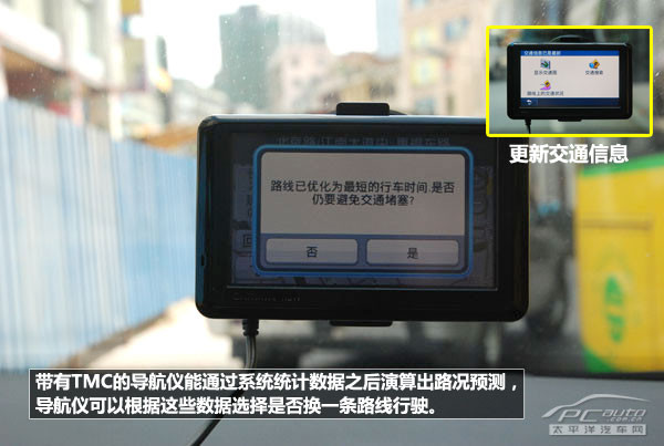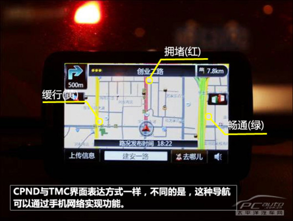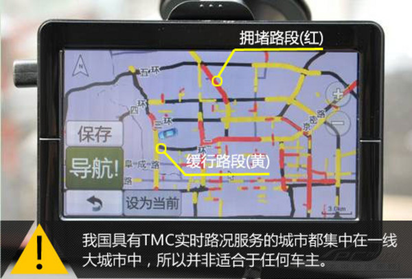 TMC实时路况可有效减少用户在道路上的拥堵时间,这个功能在国外已被认可为很实用,它能通过系统统计数据之后演算出路况预测,导航仪可以根据这些数据选择是否换一条路线行驶,从而尽量避免绕道。不过,因车况比较难以掌控,所以此项功能并不能达到百分之百的规避拥堵。