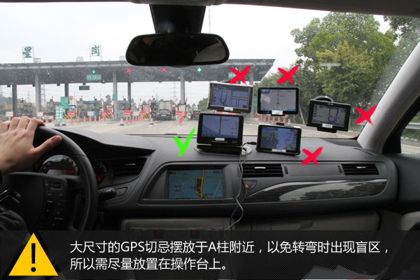 GPS导航仪不要因自己的操作习惯而随意摆放,一定要摆放于不影响行车视线的位置。比如说大尺寸的GPS因为屏幕过大切忌摆放于A柱附近,以免转弯时出现盲区,而需尽量放置在操作台上。
