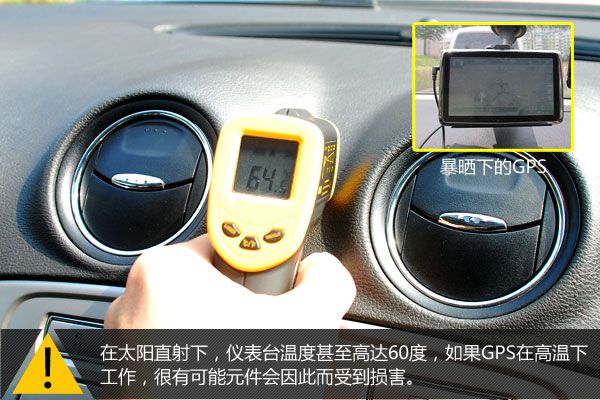 太阳直射下的GPS温度往往过高,则易出现死机等现象。在高温时节,经太阳直射,仪表台温度往往高达50度,如果在高温下作用,GPS元件很有可能因此而受到损害。