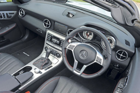 相对于标配高出4,000英镑(约合人民币4.2万元)的运动版提供红色缝线真皮内饰,用打孔真皮包裹的多功能平底方向盘很有赛车味,而且内饰品质也是无懈可击。奔驰为车主们提供了大量的高科技设备和丰富的配置清单,但值得注意的是,这些配置并不便宜。例如中控台顶端的时钟便需要你为其支付195英镑(约合人民币2031元)。更有吸引力的是通透的聚碳酸酯全景车顶,在关闭车篷时也能让阳光透进车厢内,这项配置价值410英镑(约合人民币4270元)。
