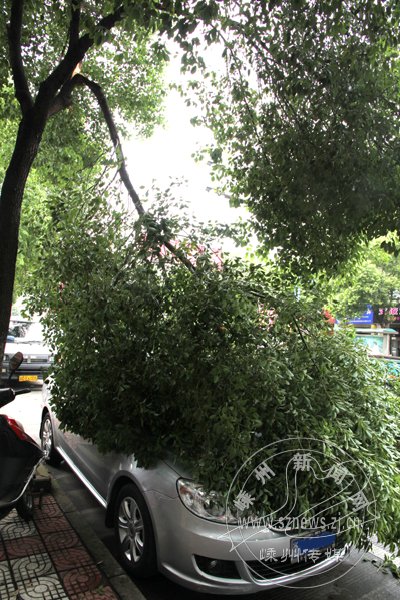 昨日下午,随着雷阵雨,官河路剡湖桥路段一棵行道树的一段树枝被风雨劈下,正好压在一辆停在路边的汽车上,幸好树枝较轻,没有对汽车造成大的损害。