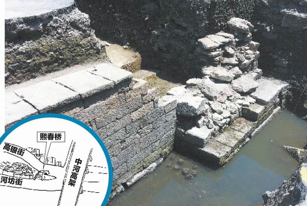 图为发掘现场的熙春桥桥基、驳岸与市河河道遗迹。林梢青 摄 制图:马骥