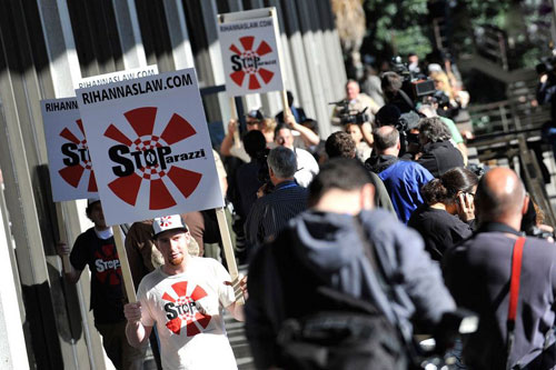 2009年,时任美国加州州长阿诺德·施瓦辛格重新修改一份在1998年制定的关于狗仔队的法案修正案。修正后的法案强调:“对于非法从名人获取视频影像、声音记录或者其他物理资料的行为,将处以5万美元的罚款。”然而也有人指责这一举措违反了有关新闻、出版自由的美国宪法第一修正案。图为2010年,洛杉矶街头抗议狗仔偷拍的民众。